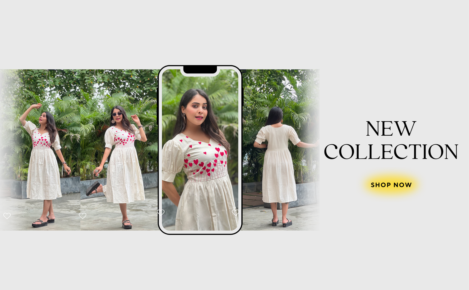 NESH CREATION Women's Off-White Cotton Western Dress with Red Heart Embroidery