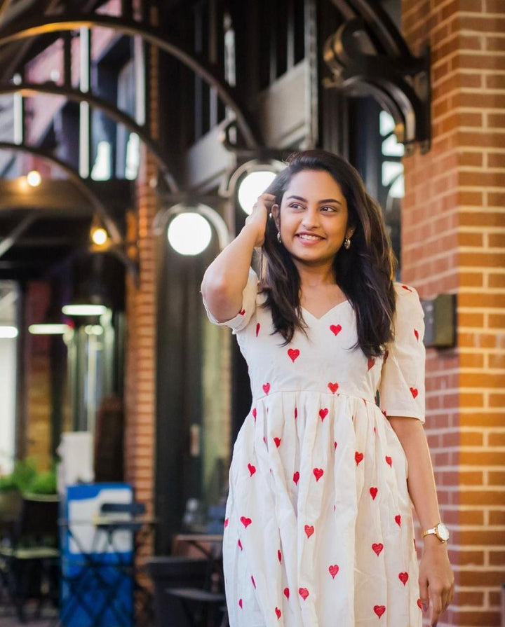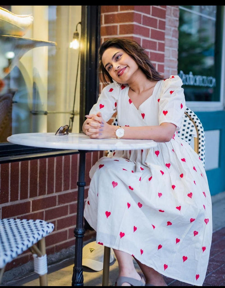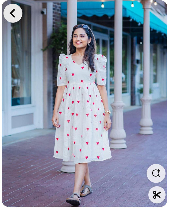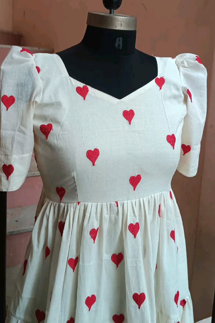 NESH CREATION Off-White Cotton Western Dress for Women with Red Heart Embroidery