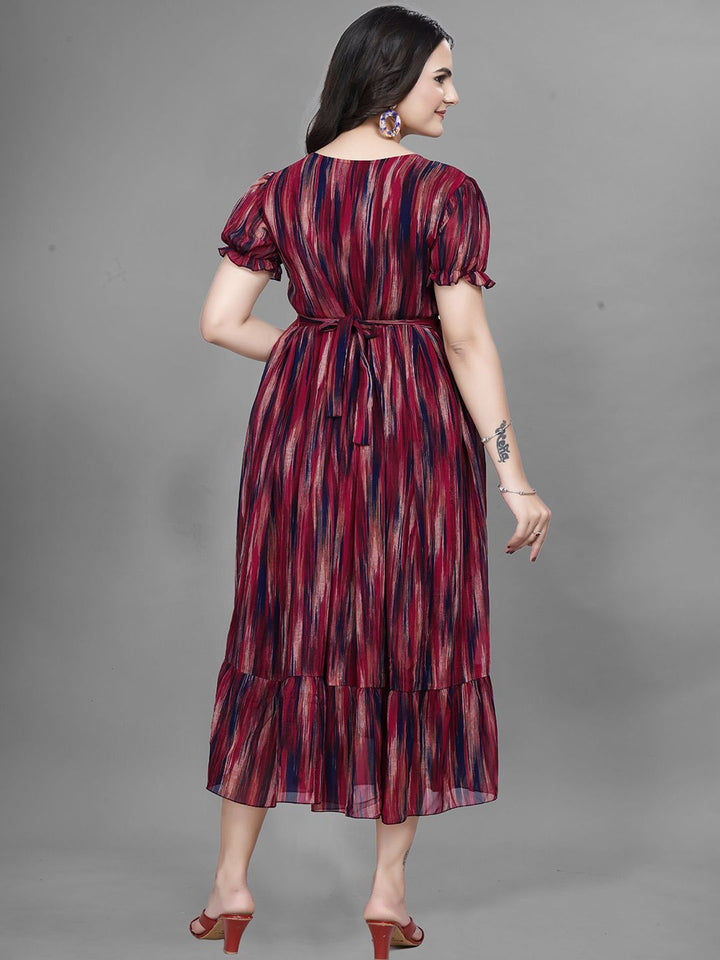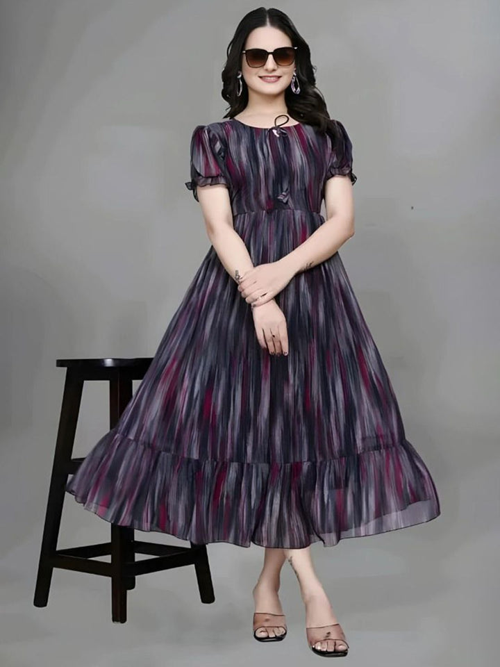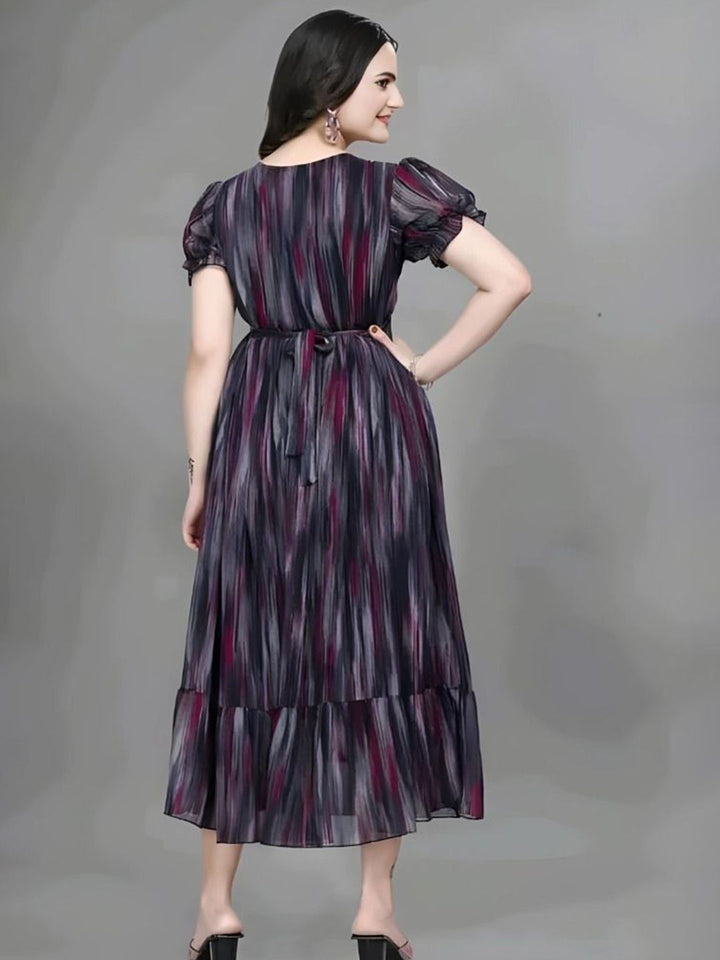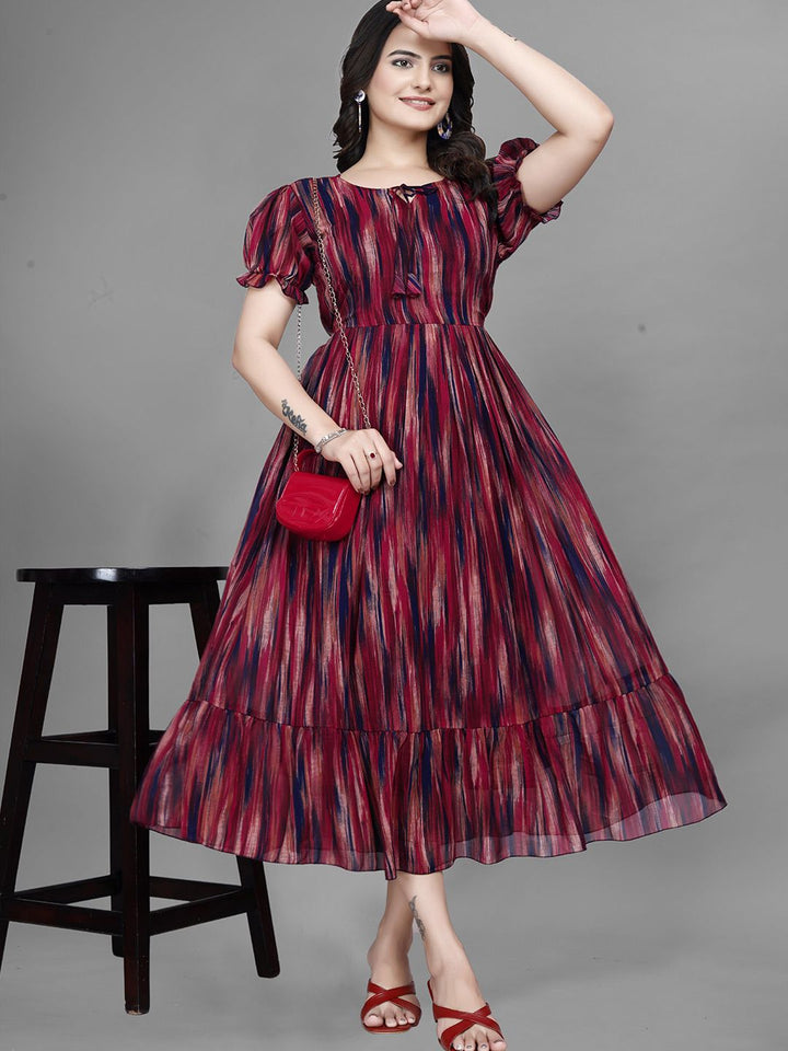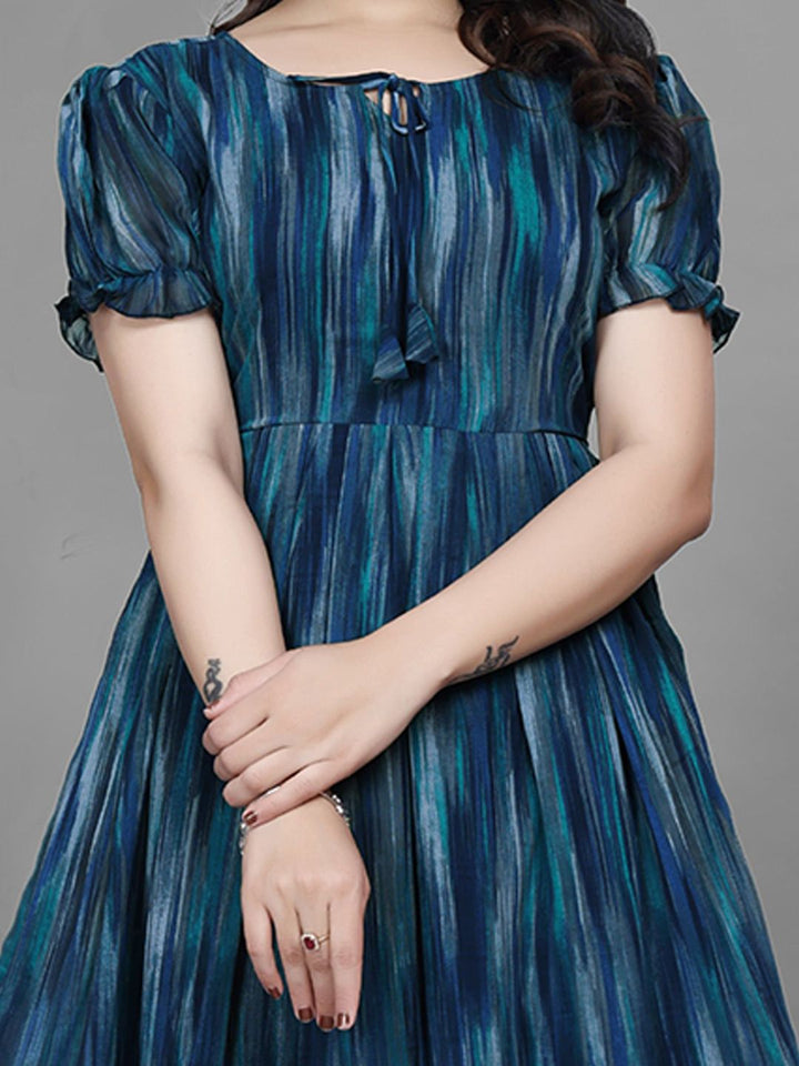 NESH CREATION Women's Georgette Western Dress | Printed One-Piece Gown with Puff Short Sleeves